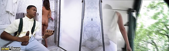 04:57Latina Kelly Oliveira takes shower before sex with large Black Beefstick