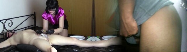 11:04Corded up husband, shaving penis and ball sack in black latex gloves