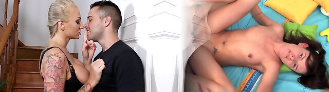 07:58Horny tattooed blondie in ebony lingerie having hook-up on the stairs